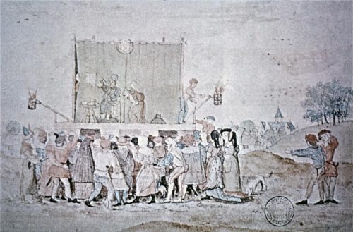 Previous Image Next Image Rederijkers01 Optreden van een rederijkersgezelschap op een verhoogd toneel, 17e eeuw.